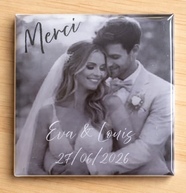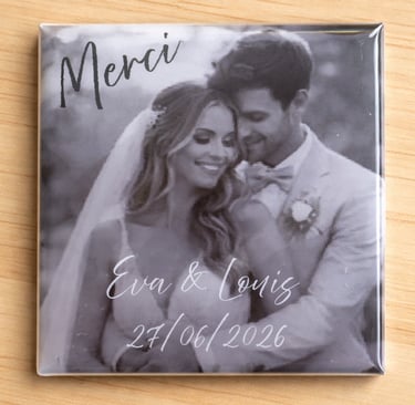 Nous créons à l'avance des magnets souvenirs ou de remerciements, à partir d'une photo de votre choix.